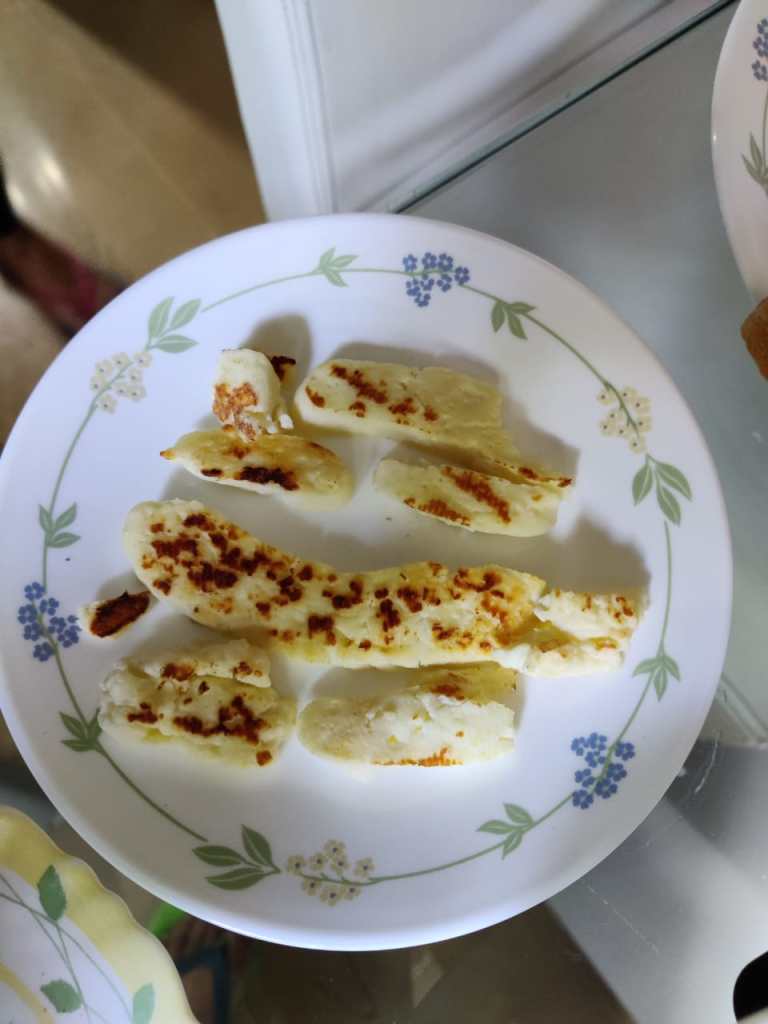 Even though I had always been curious about Halloumi, I had never had the opportunity of tasting it before the one that Namrata sent in her cheese box. To pan fry Halloumi, you need, well, a pan. That’s it. Nothing else. Cut thin slices of Halloumi cheese and fry for a few minutes on both sides till a lovely reddish char appears, and you’re good to go! Namrata’s Halloumi tasted like a slice of heaven. Mine, not so much, though it wasn’t all bad!